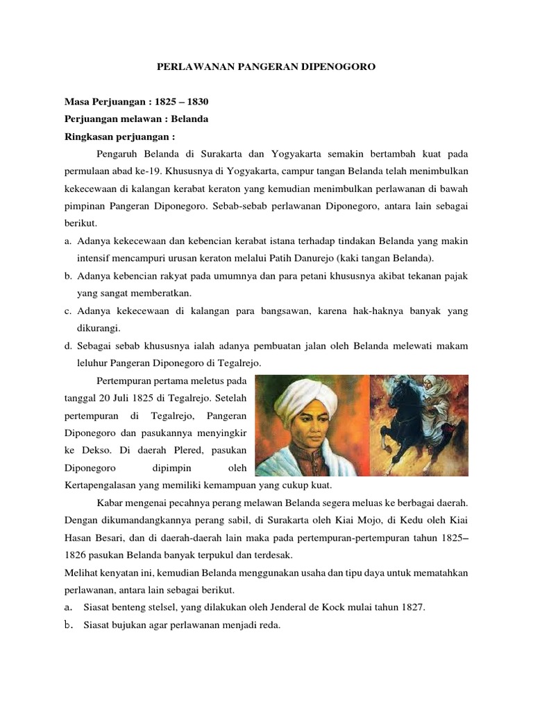 Perang diponegoro dikenal juga dengan perang jawa karena ekskalasi perlawanan pangeran diponegoro yang kian hari kian meningkat dan meluas ke berbagai daerah. Perang diponegoro sendiri tercatat sebagai salah satu perang terbesar yang terjadi di indonesia. Jendral de kock sebagai panglima tertinggi pasukan. Perlawanan yang terjadi oleh pangeran diponegoro terhadap penguasaan belanda. Dalam pembangunan jalan, jalan melewati makam orang tua pangeran diponegoro, dan beliau murka. Sejarah perang diponegoro atau bisa disebut juga perang jawa merupakan perang besar yang pernah terjadi di nusantara antara penjajah belanda dan pasukan kronologi perang diponegoro. Sejarah perjuangan dan biografi pangeran diponegoro. Menurut sejarah kerajaan mataram islam, surakarta dan yogyakarta dulunya merupakan satu kesatuan wilayah. Hatinya yang bersih dan sebagai seorang pangeran akhirnya menuntunnya menjadi seorang yang harus tampil di depan guna membela kehormatan keluarga. Perang diponegoro atau perang jawa adalah pemberontakan yang dilancarkan oleh masyarakat jawa di bawah pimpinan pangeran diponegoro. Perang ini menewaskan kurang lebih 200.000 orang baik militer maupun sipil, menjadikannya pemberontakan paling berdarah dalam sejarah hindia belanda. Pangeran diponegoro terkenal karena memimpin perang diponegoro atau perang jawa yang berkecamuk mulai tahun 1825 hingg 1830 melawan penjajahan hindia belanda. Diponegoro lebih sangat tertarik dalam sebuah kehidupan beragama dan warga negara.