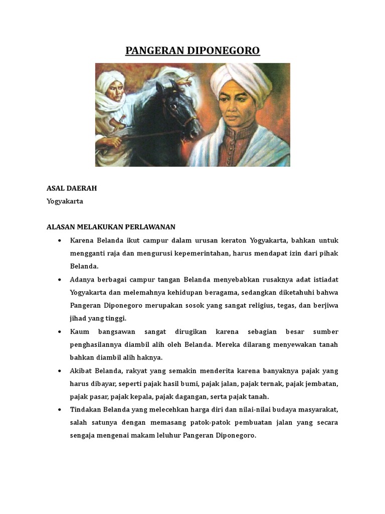 Perang ini menewaskan kurang lebih 200.000 orang baik militer maupun sipil, menjadikannya pemberontakan paling berdarah dalam sejarah hindia belanda. Lahir pada tanggal 11 november 1785 di yogyakarta dari. Pangeran diponegoro setidaknya pernah menikah hingga 9 kali disemasa hidupnya. Hal yang menjadi sebab utama perlawanan pangeran diponegoro adalah adanya rencana pembuatan jalan yang melalui makam leluhur pangeran perang diponegoro menggunakan siasat perang gerilya untuk melakukan perlawanan terhadap belanda. Hatinya yang bersih dan sebagai seorang pangeran akhirnya menuntunnya menjadi seorang yang harus tampil di depan guna membela kehormatan keluarga.